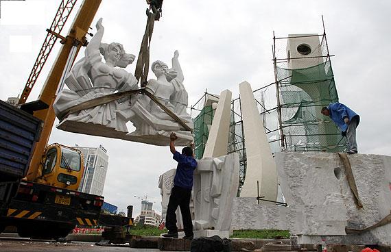2010年在煙臺市文化中心文化廣場,修繕完成的“智慧之門”人物雕塑部分開始吊裝。