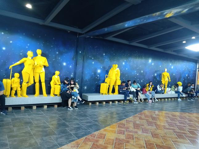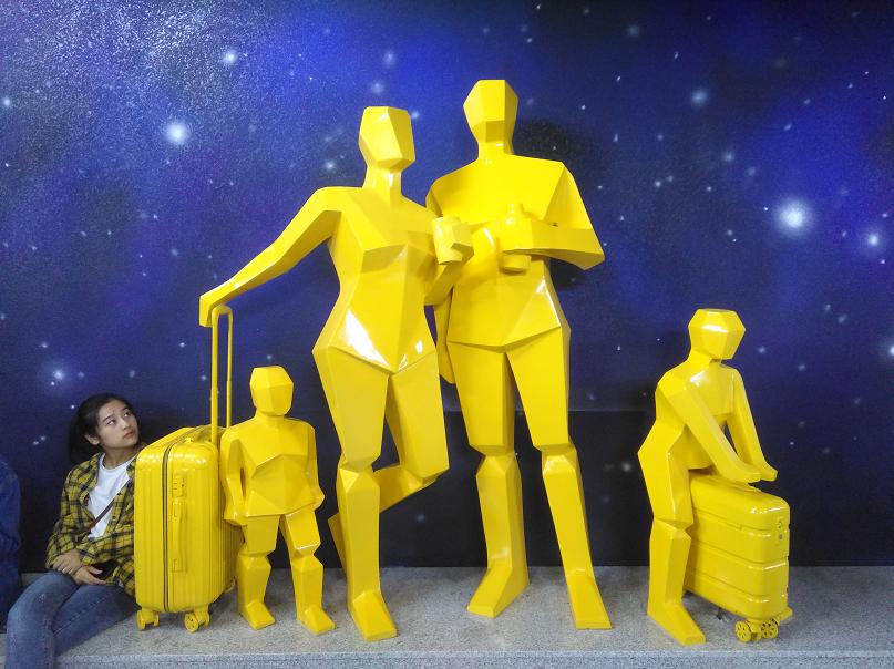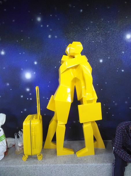 煙臺大悅城B-1層新裝開業(yè),設(shè)計火車站臺現(xiàn)代抽象人物雕塑群,材質(zhì)玻璃鋼。昌林雕塑13853539222 承擔(dān)制作。雕塑以抽象塊面手法塑造,明黃漆飾面,以現(xiàn)代明快感配合火車站臺景觀,塑造了在都市中火車站臺人們告別、送行等場景。有家庭、朋友、單人組成,雖然是抽象手法,但依然可見人物個性和特征,是煙臺雕塑尤其是商業(yè)區(qū)場景雕塑中較成功的作品。