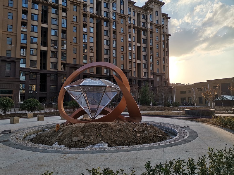 蓬萊不銹鋼鉆石&水晶雕塑,位于蓬萊居佳領海小區(qū)水晶園景區(qū),304不銹鋼制作,雕塑高3米,寓意水晶婚紀念。昌林雕塑2019年11月制作安裝。