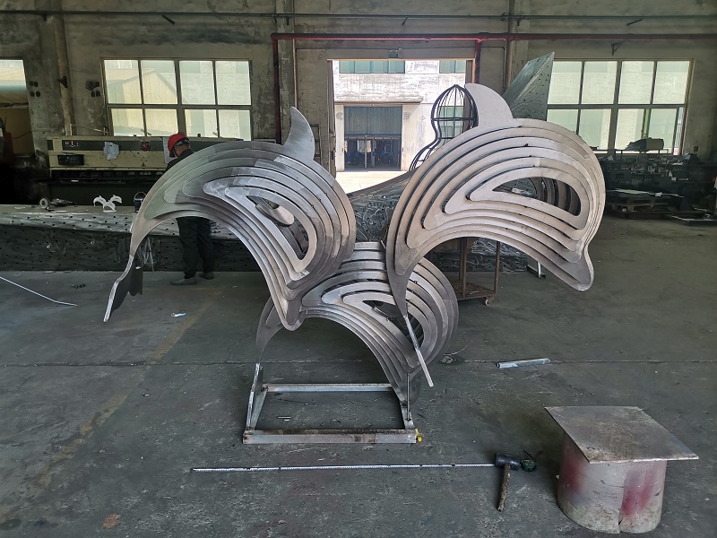煙臺(tái)雕塑 煙臺(tái)開發(fā)區(qū)樂橙小區(qū)不銹鋼雕塑 海豚雕塑 材質(zhì)2mm304不銹鋼 拉絲 昌林雕塑2023年制作安裝